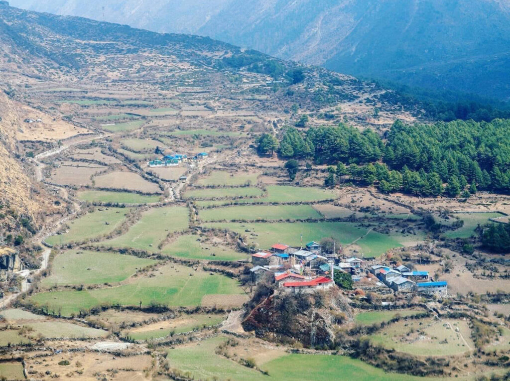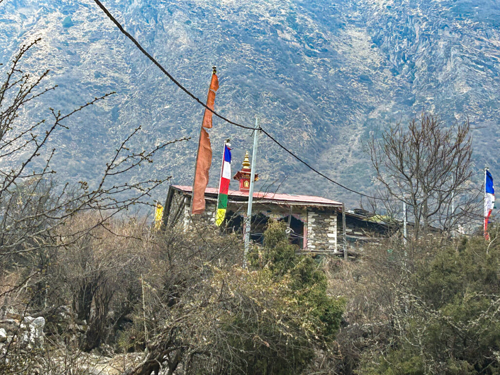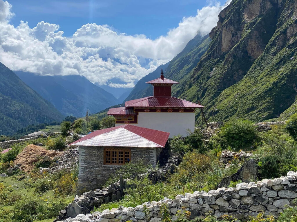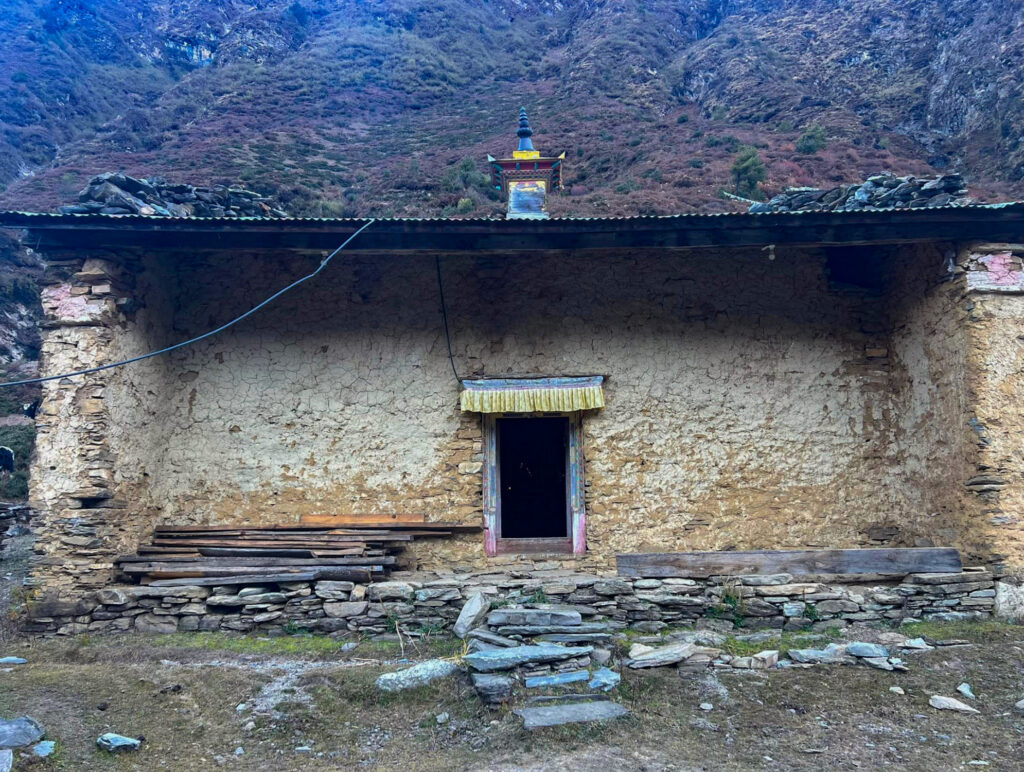 Leru Lhakhang, also known as Tashi Thongmön, is described in Tsum history as the oldest monastery in Tsum. The monastery has a wondrous shape, appearing as if nestled in the lap of Jetsun Drolma (Tara). Its name, Tashi Thongmön, means “Auspicious Wish-Fulfilling Vision.” According to old Tsumpa writings, the reason for this name is explained: “The father Fawa Jamo, having received Dharma teachings from his guru, wished for the attainment of this Buddhist Dharma. Thus, the monastery was named Tashi Thongmön.”