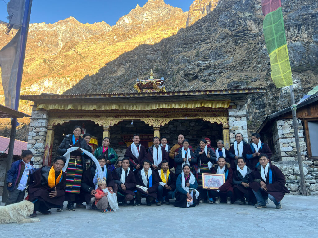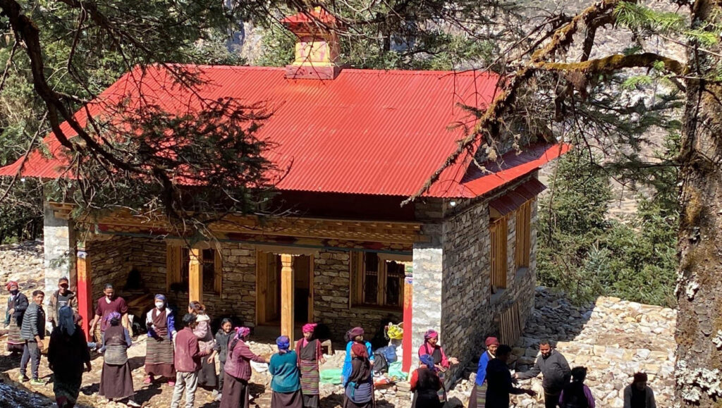 Annually, the local community collectively performs the Konchok Chidü Drubpa, a Terma teaching of Terton Guru Chöwang, for seven days, and observes the tenth day of the month regularly. Under the leadership of Dungse Pasang Phuntsok, and with the support of committee members Kalsang Phuntsok, Tsering Phuntsok, Tashi Dorje, Tenzin Palbar, Apè Ringpo, and Tenzin Wanggyal, as well as devotees from both Leru and Ngakyü, a new temple with four pillars was rebuilt to match the original dimensions of the old monastery. While all monasteries in the Tsum region traditionally had stone roofs, which often led to water damage, the new temple is now covered with thick corrugated iron sheets.